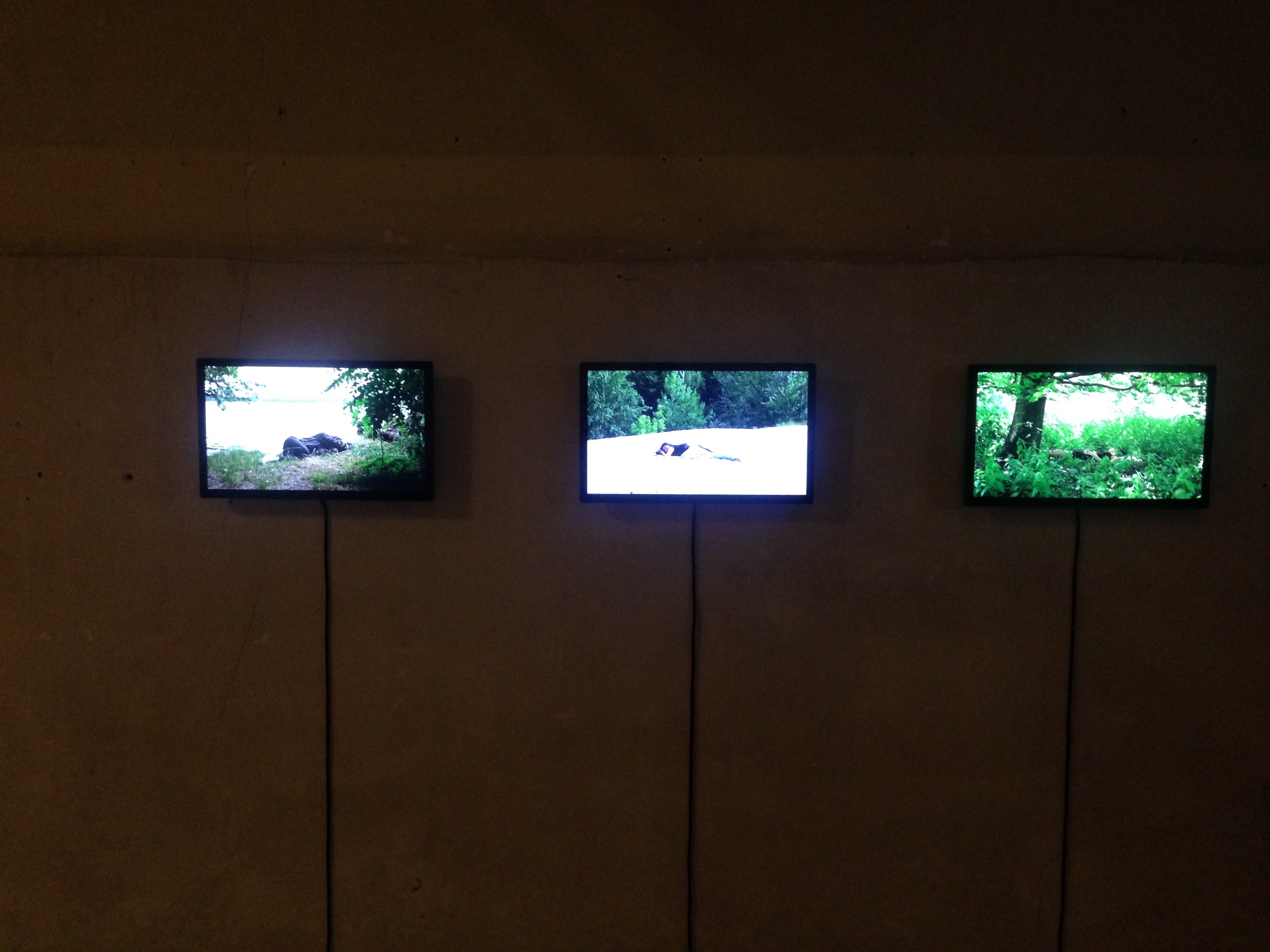 The work ‘One says goodbye and does not leave: migrant geographies’ (my translation) consists of a collection of recordings. On three screens, you see three woman sleeping: in a forest, on a sand hill and near a lake. The films display their sleep in real-time. On the opposite wall, a collection of pictures of the very same sleeping women are shown. They are presented in a modest way: in standard 4×6 inch format, directly attached to the wall. A neat pile of pictures is presented as a sculpture behind glass in the middle of the room. Perhaps those pictures did not make it to the selection on the wall. Nevertheless, their hidden presence seems to reveal that not every moment can be accessed. In the back of the room, three pencil drawings are connected to three headphones. They allow you to listen to the stories of the sleeping women. They appear to be Latin-American migrants in Germany, who were asked by the artist to sleep at a place where they felt connected with nature. The conversation is about the experience of being a migrant. ‘Only in Germany I felt the need to shape my Latin-American identity, because people looked at me that way’ notices one of the women. Songs of birds, twigs rustling in the wind and streaming water can be heard in the background – sounds that bring you back to the landscapes on the photographs.