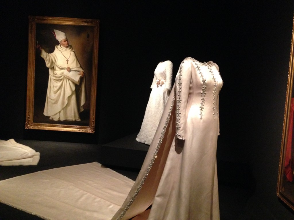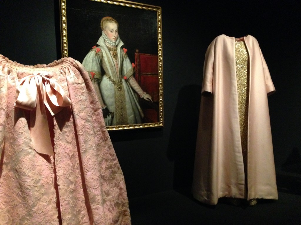 In de tentoonstelling overheerst kunst van de juxtapositie: het creëren van een effect door het naast elkaar plaatsen van elementen. Moderne jasjes met lovertjes pronken naast de overdadig versierde kostuums van geschilderde Habsburgers, een strakke zwarte mantel resoneert met het traditionele gewaad van een non en het heldere geel van een avondjurk, lijkt rechtstreeks uit een Annunciatie van El Greco te komen.