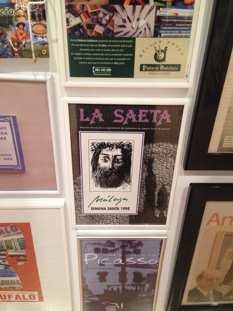 ‘Picasso is een complex fenomeen’, zegt López Cuenca in een interview[1]. ‘Ik heb het niet per se over het individu, niet eens over de kunstenaar, maar over een commercieel merk, een branche dat op elk willekeurig product kan worden toegepast’. In de afgelopen decennia zag de hedendaagse kunstenaar de stad Málaga waar hij opgroeide en waar ook Picasso ter wereld kwam, picassoficeren. De losse lijnen en de kubusvormen van de stijlen van Picasso zijn als het ware de huisstijl van de stad geworden. Winkeltjes, restaurants en hotels met de naam ‘Picasso’ schoten uit de grond en steeds meer toeristenartikelen verschenen met zijn schilderijen en tekeningen erop. Typerend is de poster van de Semana Santa uit 1998, ook in het winkeltje van López Cuenca te vinden. Op de poster is een litho van Picasso te zien, een vlug portret van Christus, waaronder de letters ‘Málaga’ prijken in zijn handschrift. Ook een ernstig katholiek feest als de lijdensweek kan gepicassoficeerd worden!