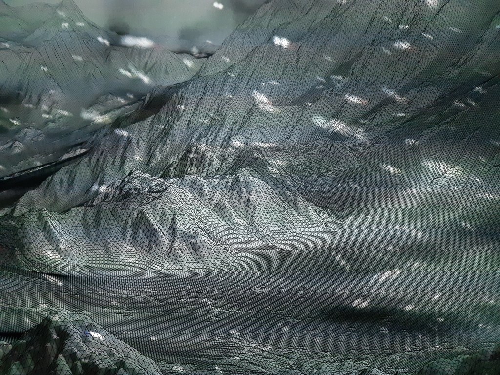 Wat de titel al duidelijk maakt is dat MOUNTAIN het resultaat is van duizenden polygonen – veelhoeken. Een door een algoritme verstoord raster bracht mij in vervoering.
