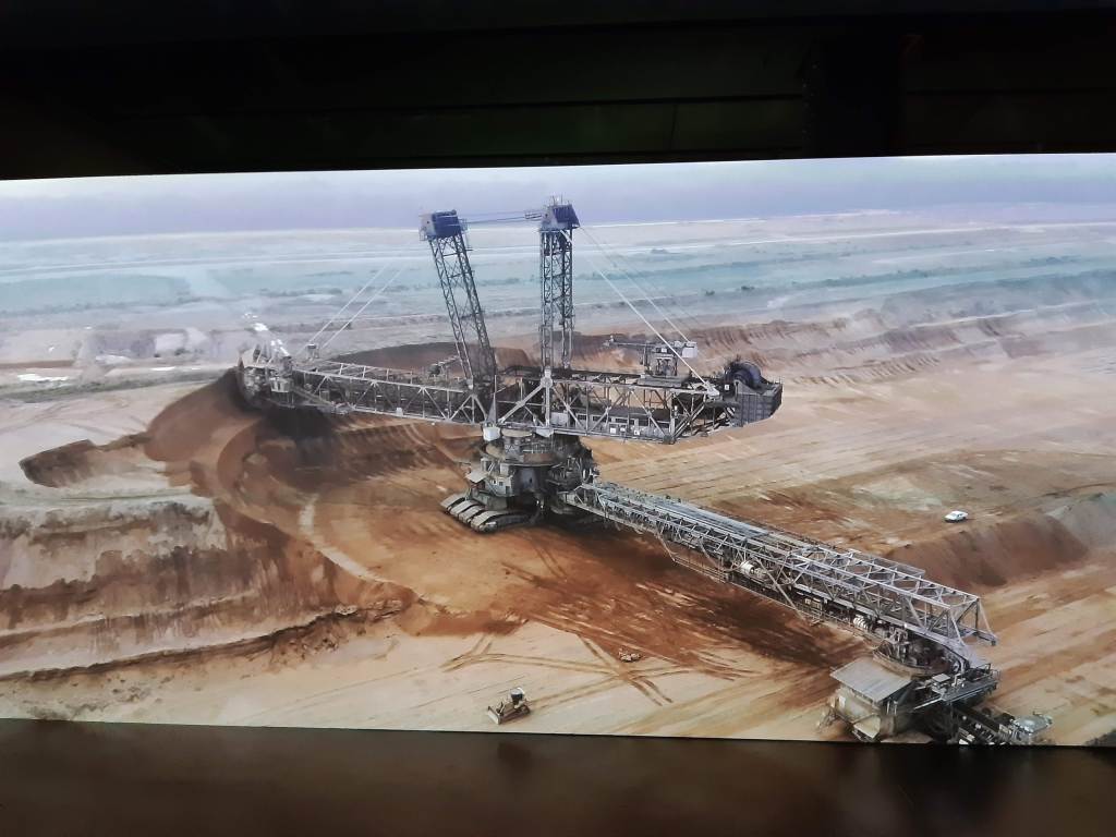 Het tweede is activistisch. In de laatste zalen zien we leden van Extinction Rebellion vechten tegen het reusachtige menselijke monster dat de mijn verbeeldt. Als mieren verspreiden ze zich over een klein deel van het landschap. Ze hebben plezier, maar vallen weg tegen de enorme leegte.