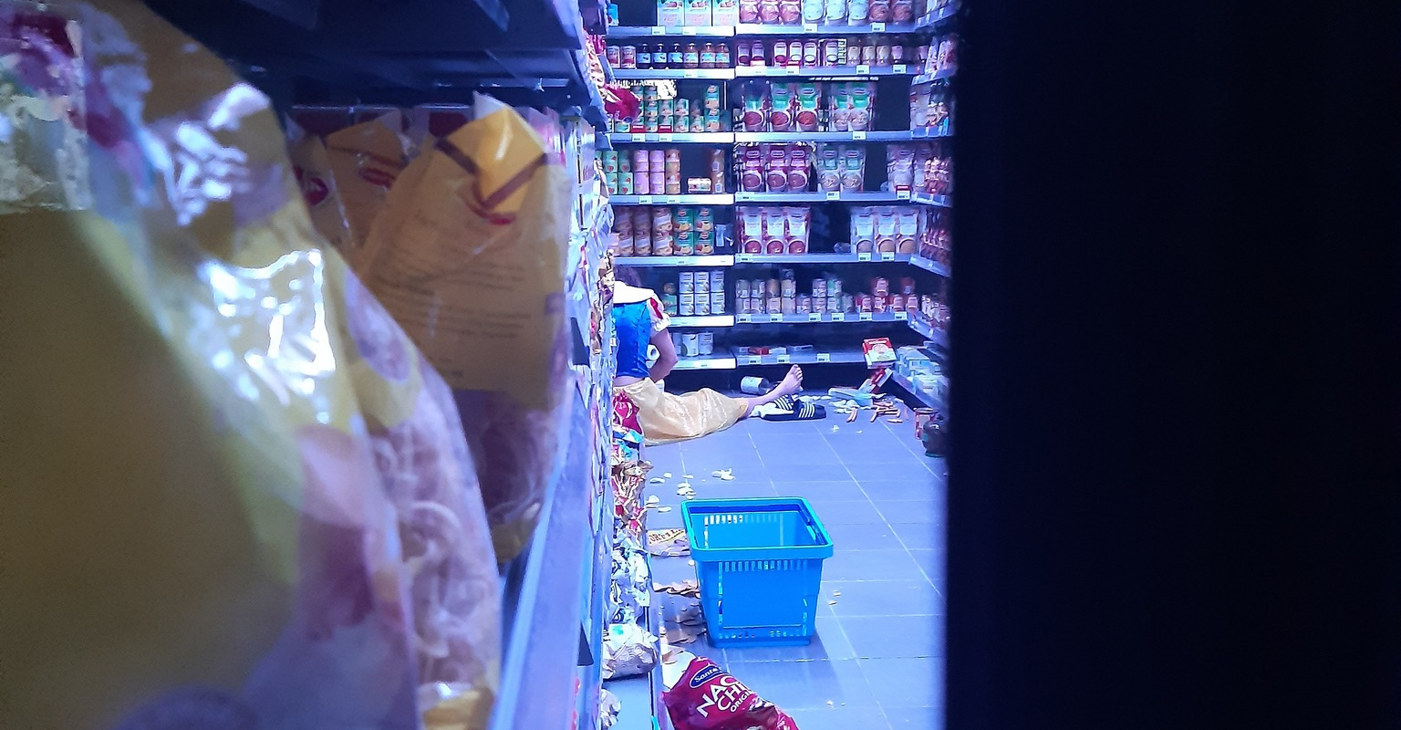 Als bezoeker kun je de supermarkt niet in, maar je kunt wel gluren. Daarvoor zijn twee manieren. De een is simpelweg door te bukken of op je tenen te staan, om door de volgepakte schappen heen te kijken. De ander is indirect, via de omliggende muur. Daar hangen TV’s met beelden van de veiligheidscamera’s uit het supermarktje. Deze vreemde variatie op het panopticum creëert een boeiend spel van kijken. Met moeite zie je de live spelende performer die ook nog eens verstopt zit achter dat varkensmasker met enorme onschuldige ogen. Tegelijkertijd is haar beeld via de schermen het meest zichtbare.